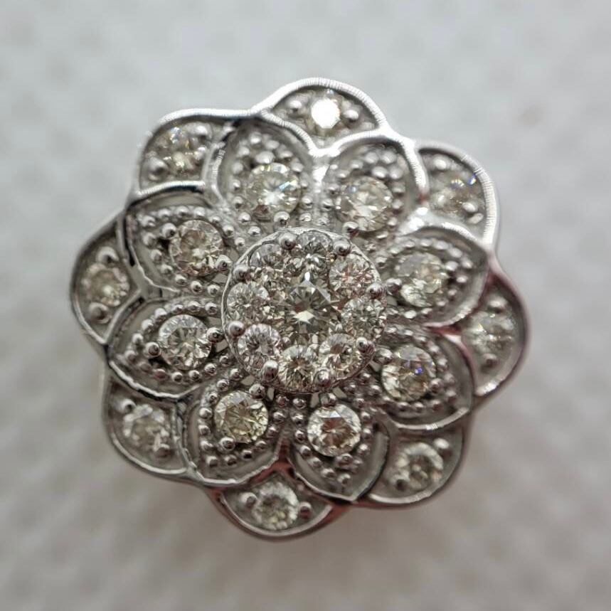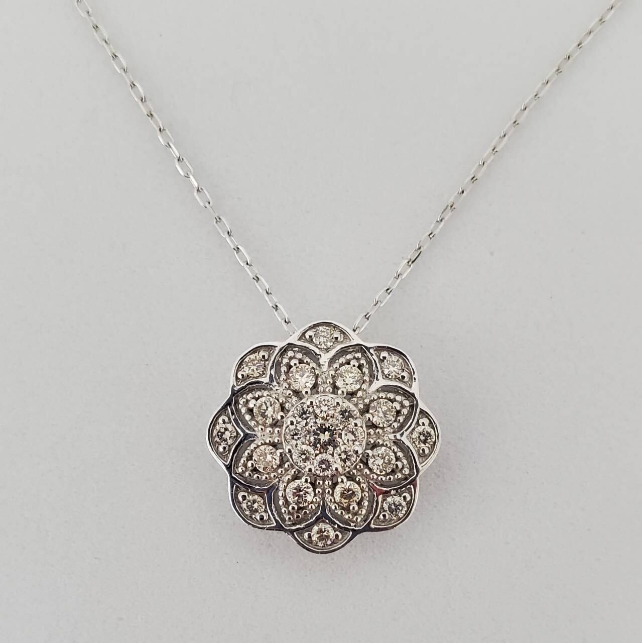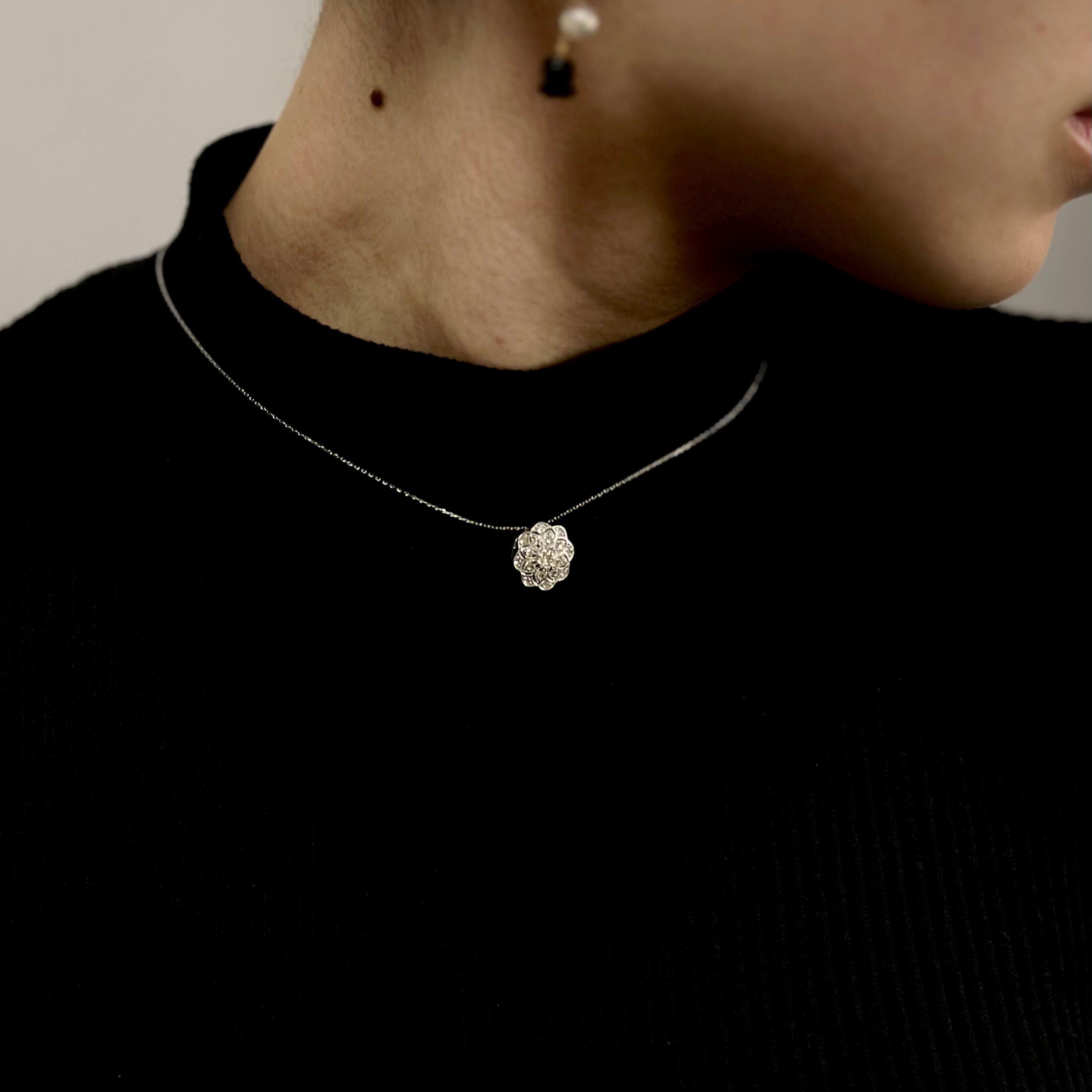 0.32ctの輝くダイヤモンドとK18ホワイトゴールドで仕上げた花形ペンダント。上品な輝きが日常を特別なものに変えます。