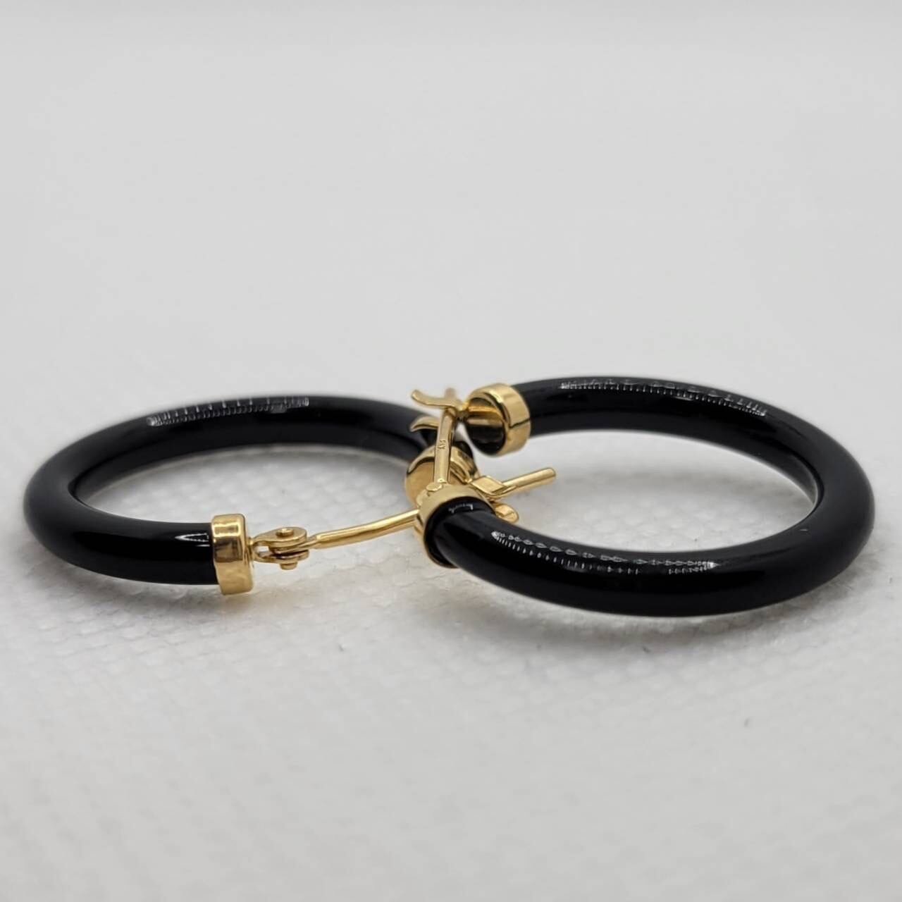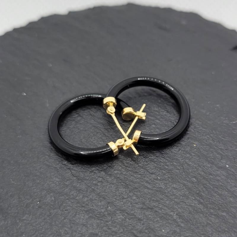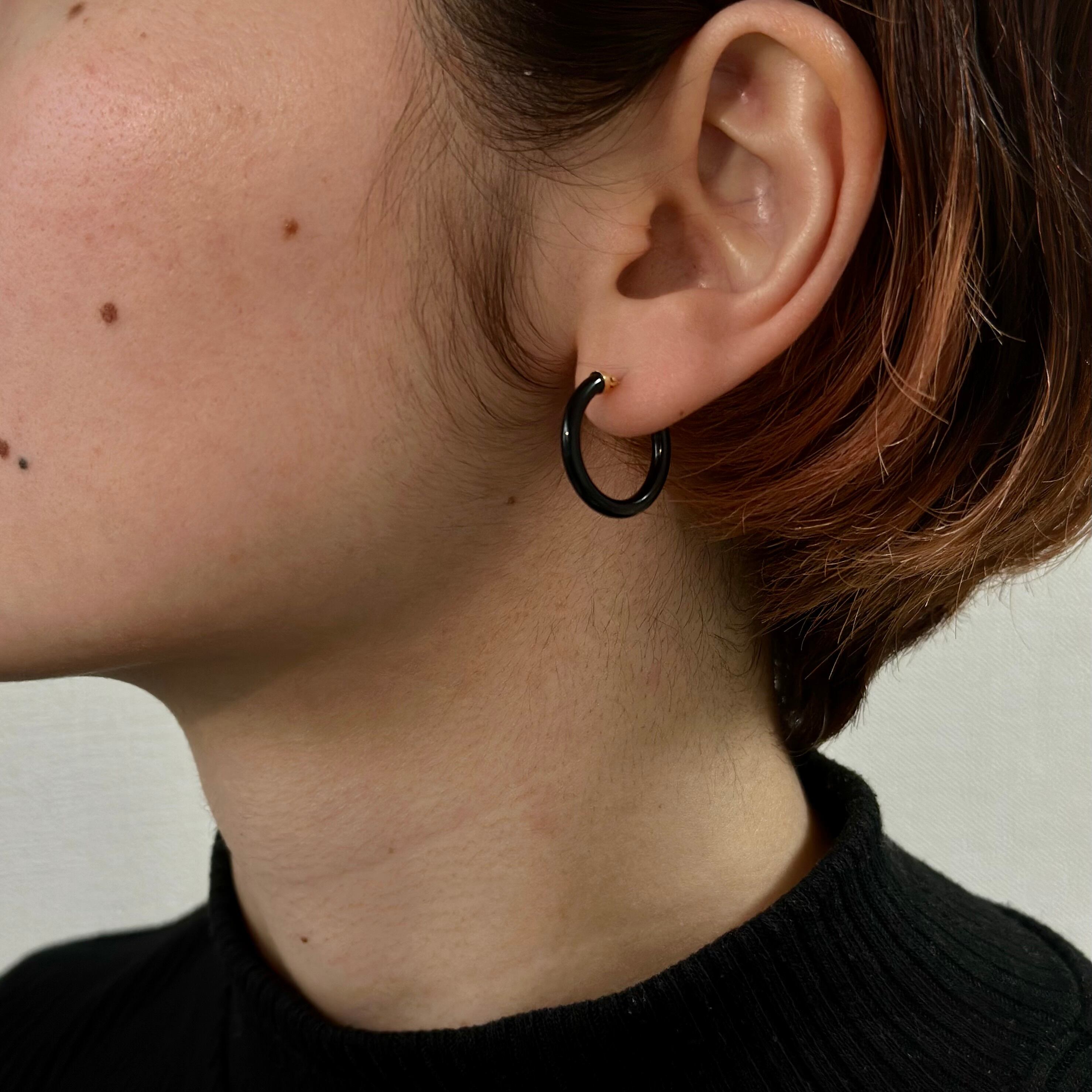 K18ゴールドとオニキスのフープ型ピアス。シックな輝きが、日常にも特別な日にも洗練を加える一品です。