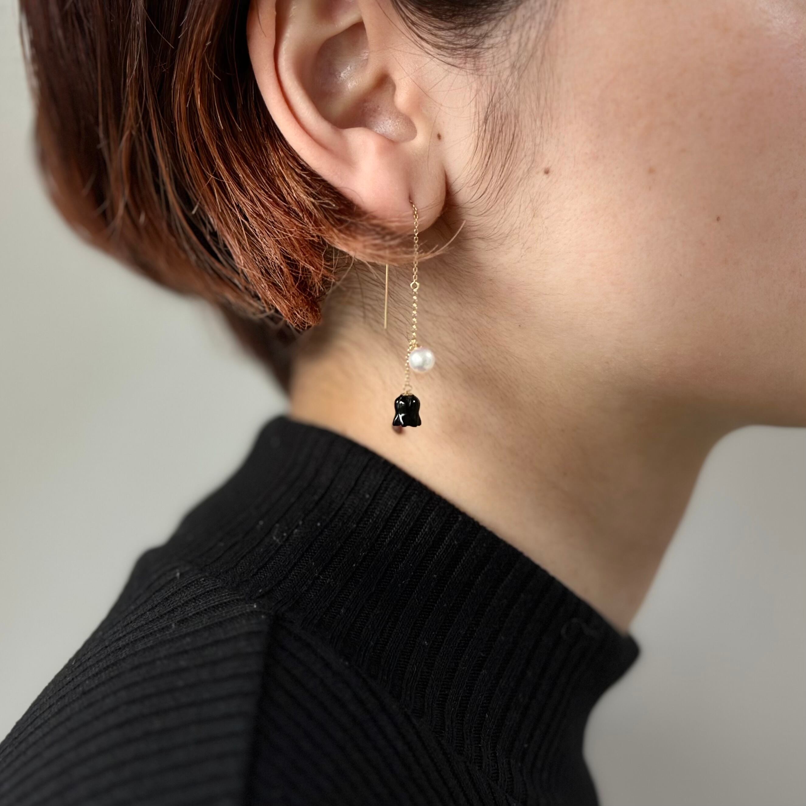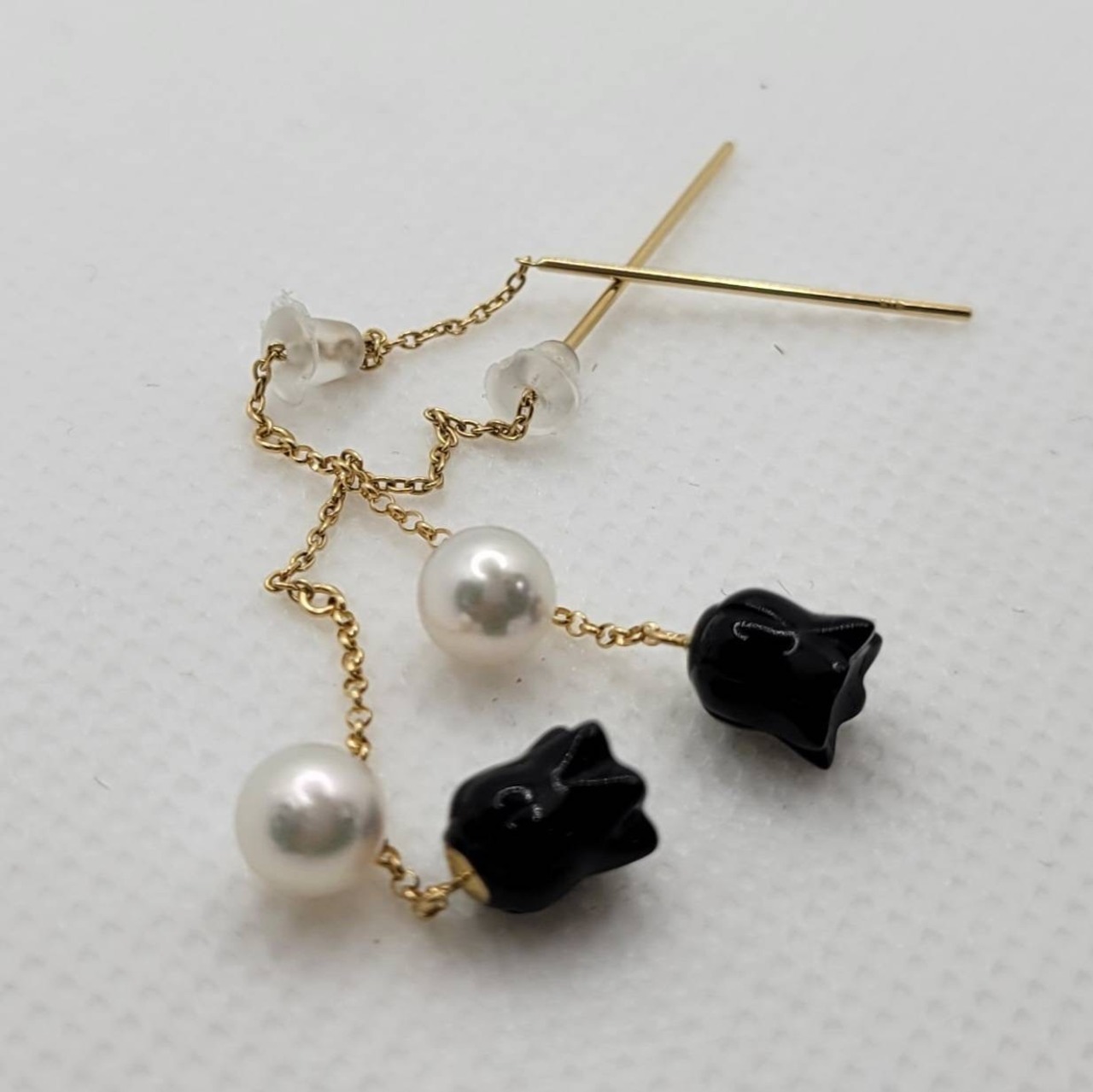 K18ゴールドにオニキスとパールを組み合わせたピアス。上品な輝きで、どんな装いにも洗練されたアクセントを。