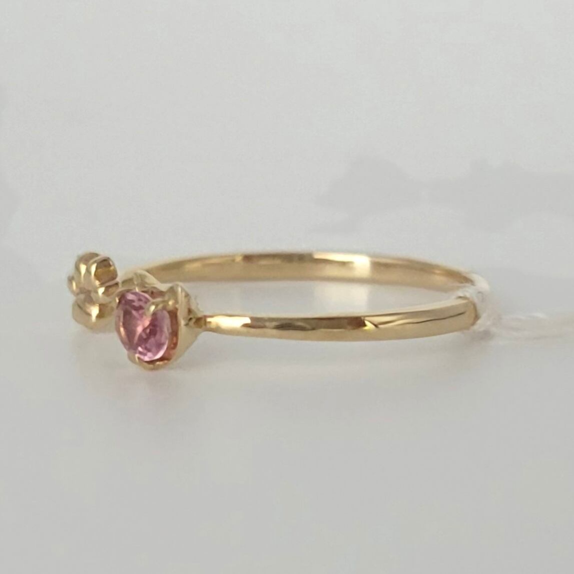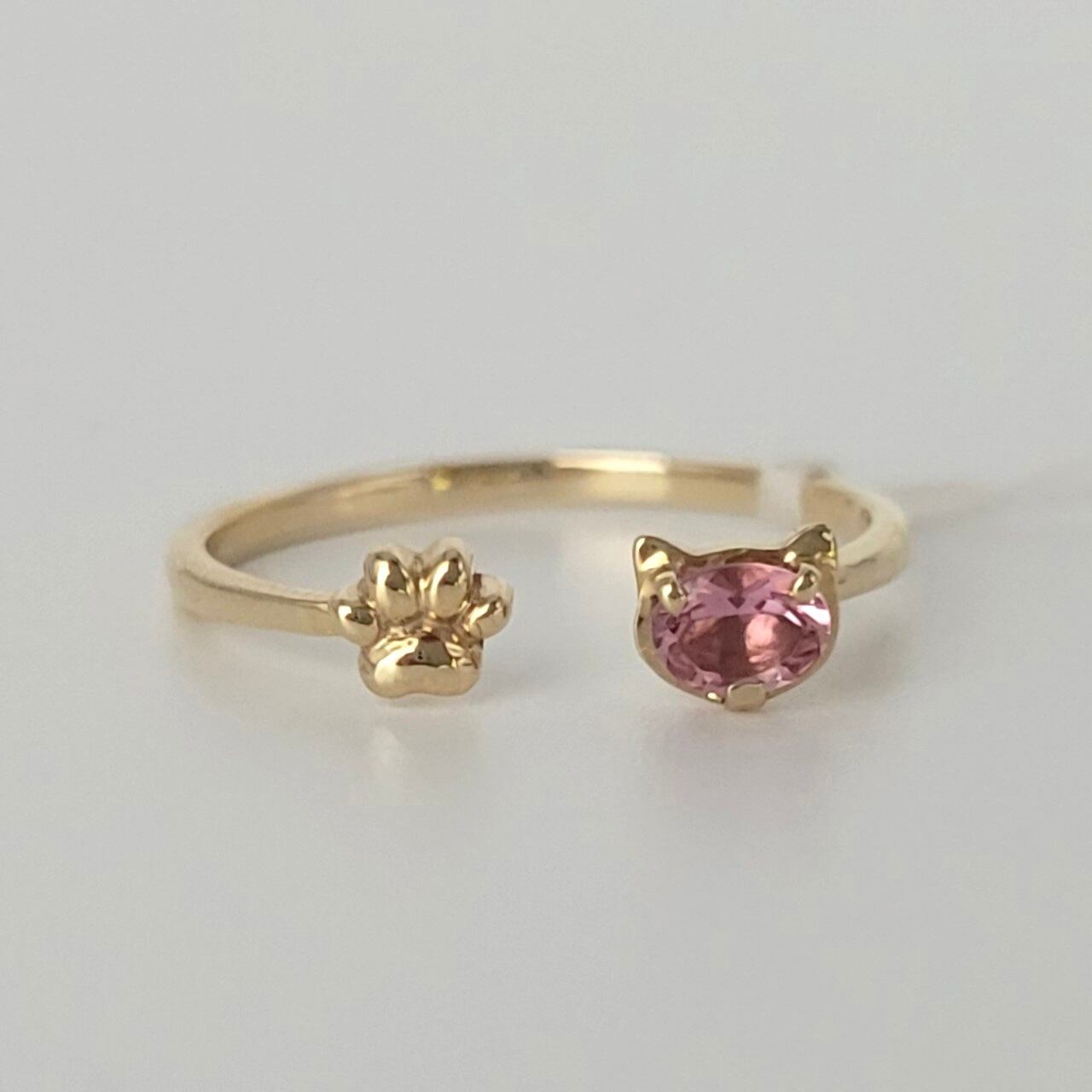0.16カラットのピンクトルマリンをあしらった、K10ピンクゴールド製の猫モチーフリングです。可愛らしい猫のデザインが、あなたの手元に遊び心と華やかさを添えます。